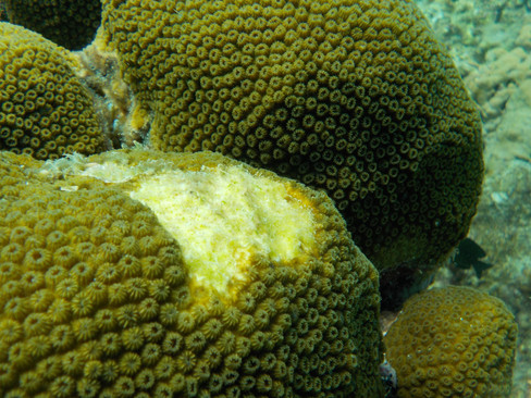 this means a potential onslaught from the 7 known biotic diseases known to infect their colonies (Weil et al. 2009). Of these, Yellow Band Disease (YBD) is the most identifiable to boulder colonies. Much like the name entails, YBD is a pathogen that produces a yellow band of infected polyps, which progresses across the colony as polyps die and leave behind exposed calcium carbonate skeleton (Fig.2). Because corals derive 80% of their energy from photosynthesis, the destruction of the photosynthetic polyps implies that the entire host organism is weakened the further the infection progresses (Weil et al.